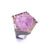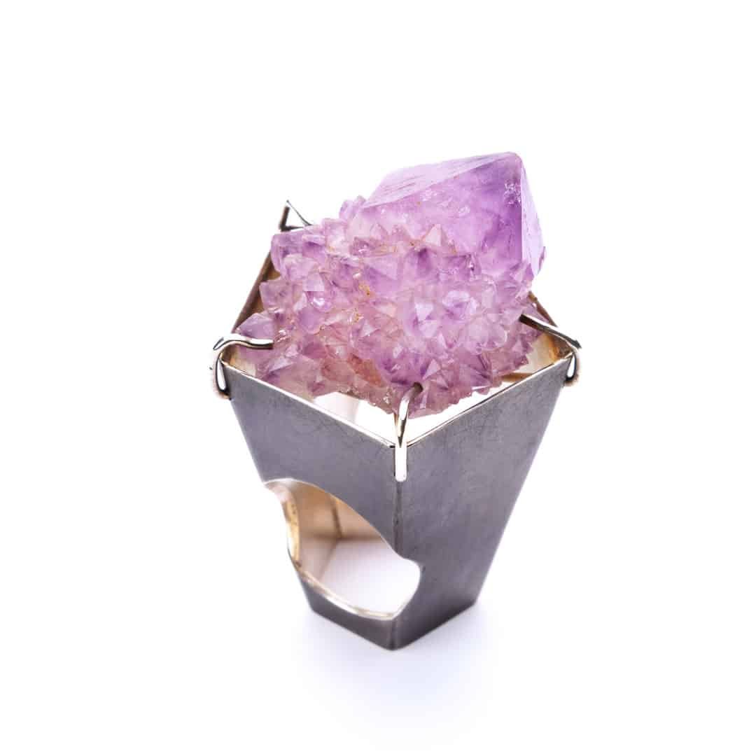 El anillo Pentagon es una pieza única. Como indica su nombre, está construido a mano en forma de pentágono en plata 925. El cuerpo tiene un acabado mate y está bañado en las caras exteriores en rodio negro. Las garras del engaste en cambio están pulidas y brillantes para darle mas contraste. Lleva engastada una bonita amatista en bruto de color violeta claro. El anillo pieza única Pentagon estaca por su forma, las grandes dimensiones y el contraste de colores. A pesar de sus dimensiones importantes, al estar vacío interiormente no tiene un peso elevado. Esto, junto con su forma, aporta comodidad a la hora de llevarlo.