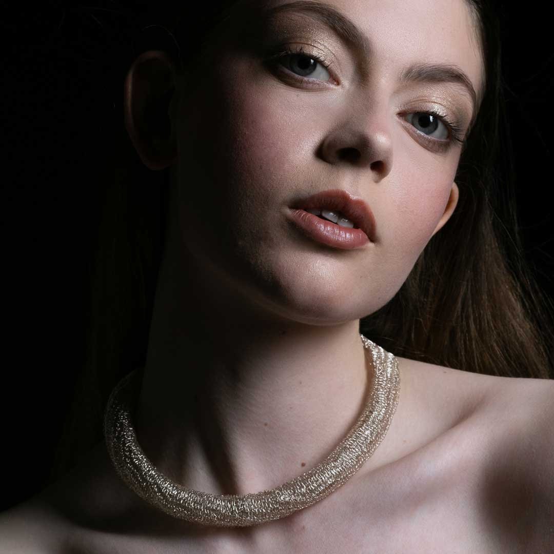 El collar pieza única KNITTED es una mezcla de ligereza, tamaño, espectacularidad y el binomio perfecto entre artesanía y tiempo. Está creado totalmente a mano. Un tubular de 1,5 cm de diámetro hecho a ganchillo con un único hilo de plata de 0,3 milímetros de grosor. El cierre está igualmente hecho a mano en plata con remaches que sujetan el tubular. El largo es típico de las gargantillas, 40 centímetros, es ideal para que el collar se apoye a la base del cuello y, al mismo tiempo, su ligereza (42 gramos) y su flexibilidad le aportan una comodidad extrema a la hora de vestirlo. Hay casi 20 horas de trabajo detrás de esta pieza 100% artesana y el resultado de pasión, tiempo y paciencia se aprecia en su intrincada trama de plata.