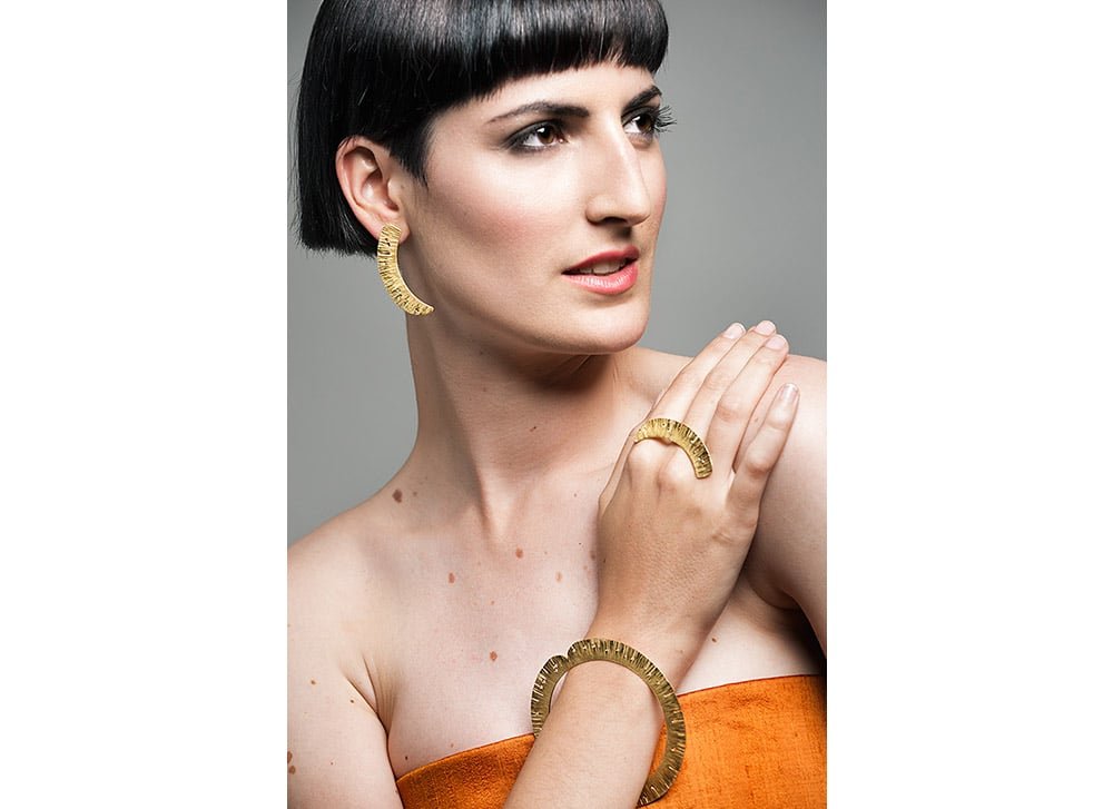 ANILLO PLANO en plata 925 y baño de oro 18kt. Acabado a mano con diferentes texturas brillantes y mate. Combina fácilmente con cualquier look tanto de día como de noche. Por esto queda perfecto en cualquier ocasión y forma un conjunto ideal con cualquiera de las joyas de la colección Ninfa. Este anillo plano ha sido elegido junto con otras piezas de la colección Ninfa para el look de una entrevista a la actriz Julia Creus.
