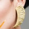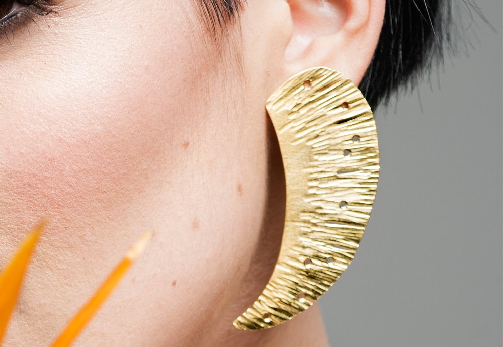 PENDIENTES EXTRA en plata 925 y baño de oro 18kt. Acabado a mano con diferentes texturas brillantes y mate. Estos pendientes extra no pasan desapercibidos, son ideales para la noche, una fiesta o un evento especial. Enmarcan y iluminan el rostro con sus reflejos dorados. Nos llena de orgullo haberlos vistos llevar por la actriz Rossy De Palma o haber sido elegidos junto con otras piezas de la colección Ninfa para el estilismo de una entrevista a Julia Creus.