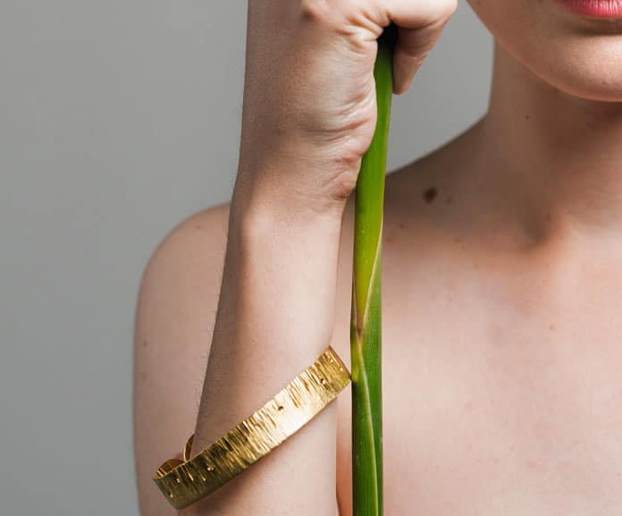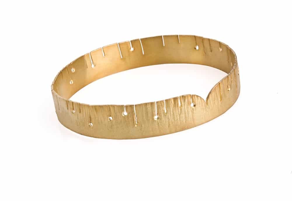 PULSERA ESCLAVA en plata 925 y baño de oro 18kt. Acabado a mano con diferentes texturas brillantes y mate. Bonita y sencilla esta pulsera rígida combina fácilmente con cualquier look tanto de día como de noche. Por esto queda perfecta en cualquier ocasión y forma un conjunto perfecto con cualquiera de las joyas de la colección Ninfa.