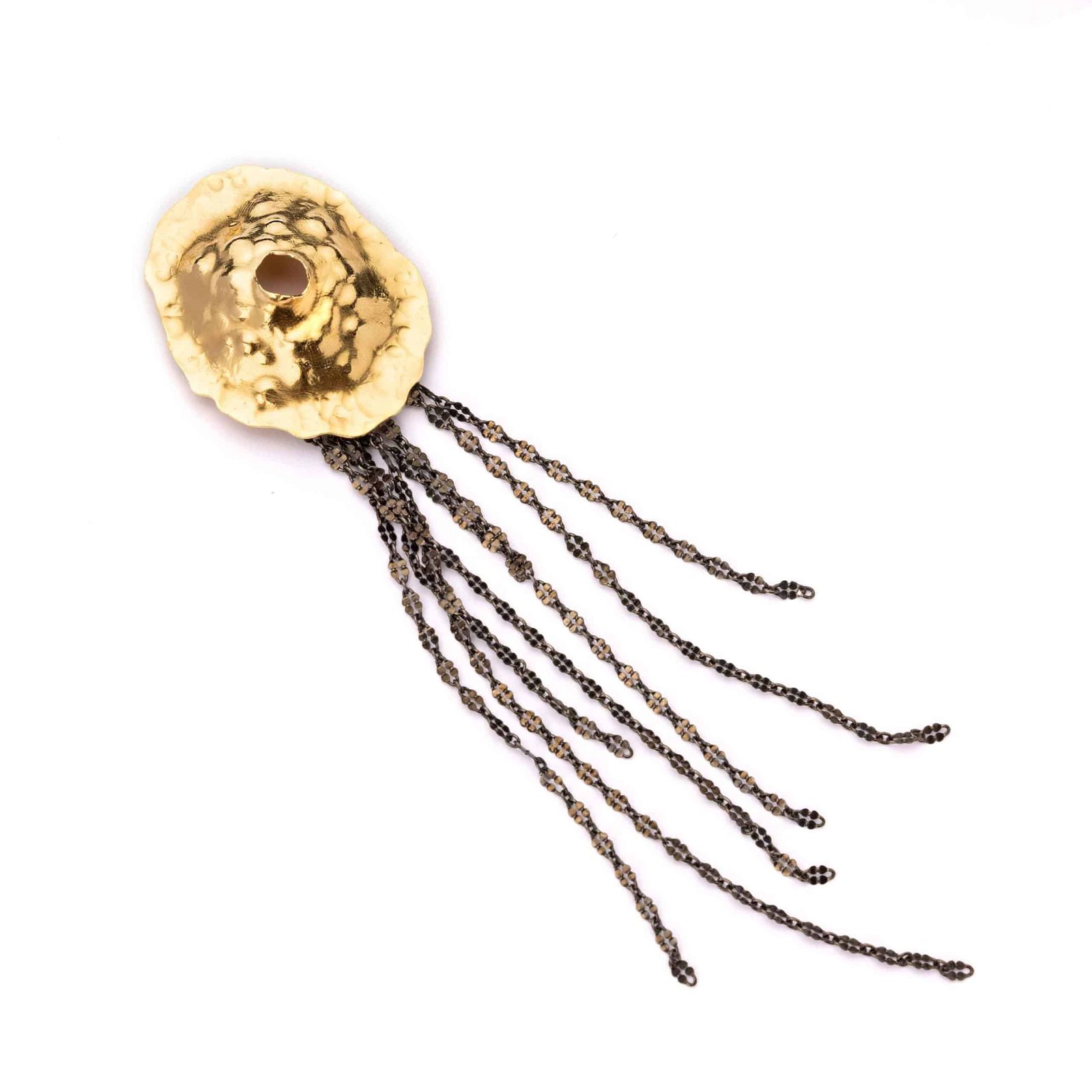El pendiente pieza única MEDUSA Small está inspirado en las medusas, animales fundamentales para nuestro ecosistema. En bronce con baño de oro y cadenas negra de rutenio.