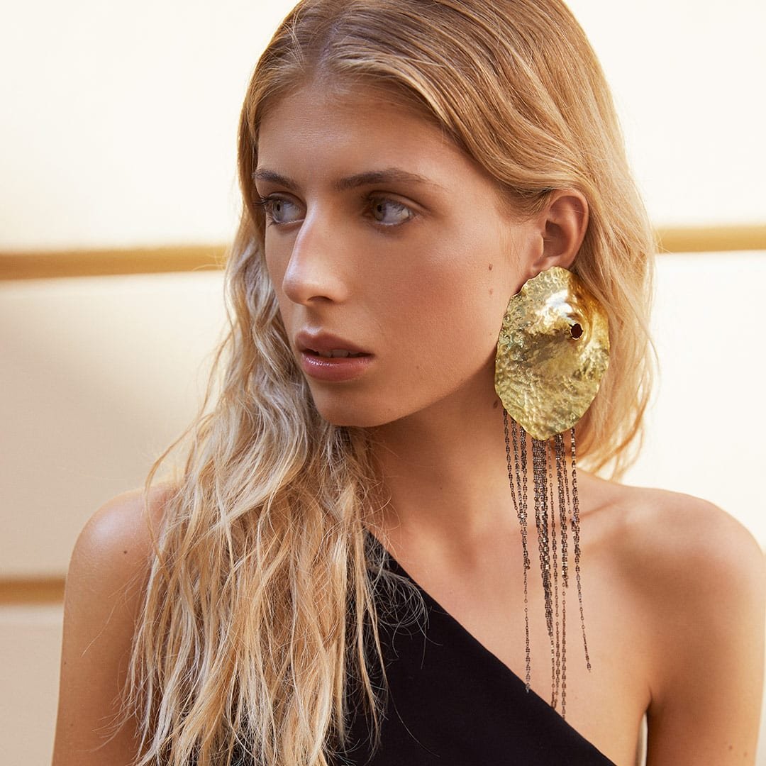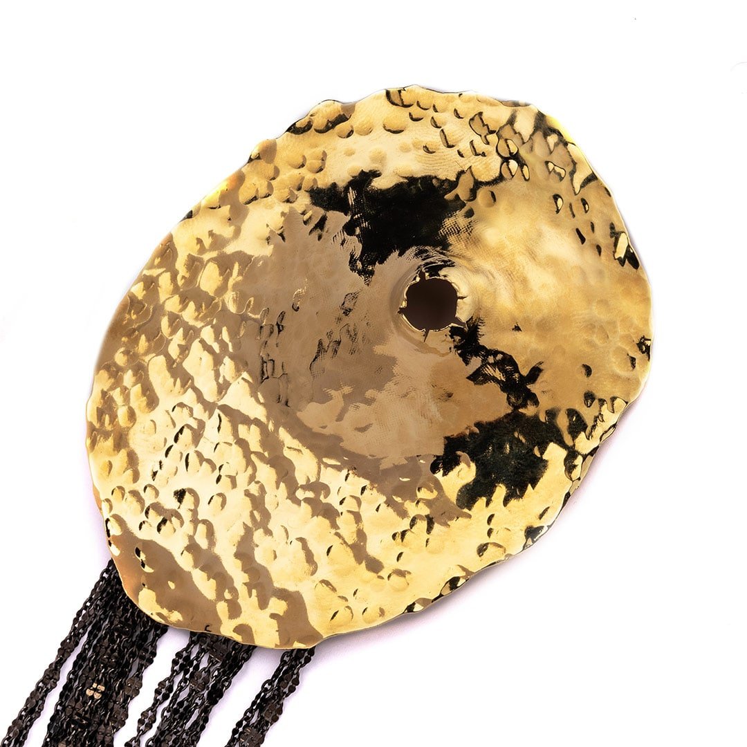 El pendiente pieza única MEDUSA es en realidad un monopendiente. Como indica su nombre, está inspirado en las medusas, animales milenarios muy temidos por sus picaduras. Personalmente les tengo bastante miedo a estos animales. En cambio y cómo reto he querido crear una joya inspirada a ellas ya que son, como muchos otros animales, fundamentales para nuestro ecosistema marino. Por ese motivo y como amante de la naturaleza y, sobretodo, del mar he querido homenajearlas con un pendiente que no pase desapercibido. El pendiente pieza única Medusa está hecho a mano a partir de una plancha de bronce que se martilló hasta conferirle la forma adecuada. Después de bañar esa pieza en oro se le añadieron unas cadenas finas negras como toque final.